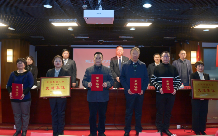 与会领导为荣获2023年度工会先进集体、先进个人代表颁奖。