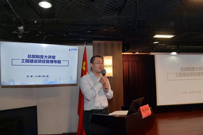 7月12日,开云在线登录总部制度大讲堂第七讲开讲。集团置业资源部高级主管(一级建造师)闫文鹏围绕工程建设项目管理相关制度及相关实操流程进行了系统讲解。