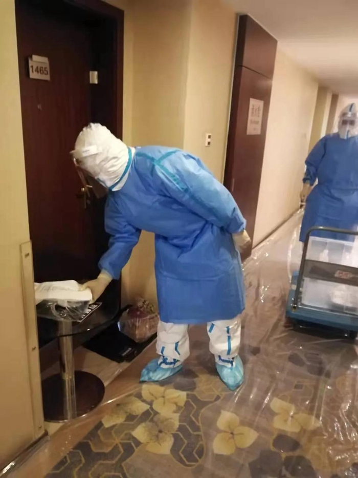此次接待任务的变化,隔离区14名服务人员每天都要多次穿脱防护服,一天下来至少需要更换5次防护服。由于防护服不透气,还特别闷,刚一行动起来,他们已经浑身是汗,护目镜上就会起一层水雾,迷糊了双眼,但他们每次都保质保量按时完成任务,14名隔离区的骨干成员,以自己的坚守展现着自己的价值。难怪有人说:“最辛苦的是始终奋战在一线的员工们,尤其是隔离区每天身穿防护服的大白们。任务承接时期,大白一穿就是14天!”