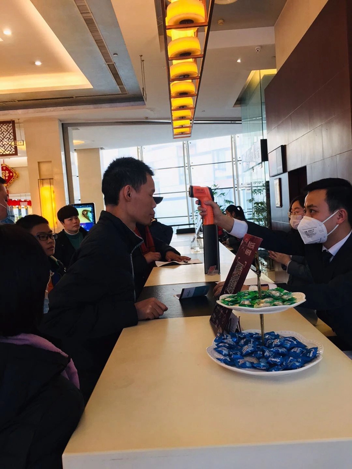在员工保障方面,酒店为员工配置了电子测温仪,每日上岗前都定时进行体温测量。员工宿舍定时进行全面消毒并做好记录,加强通风。合理安排员工餐,保证员工饮食均衡,提高员工自身抗病能力。