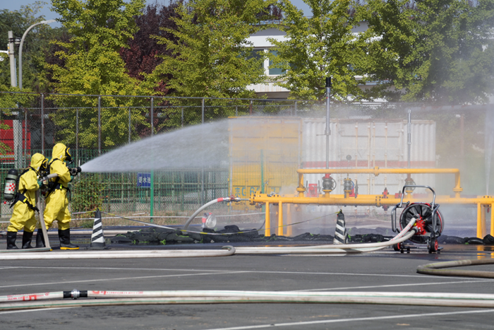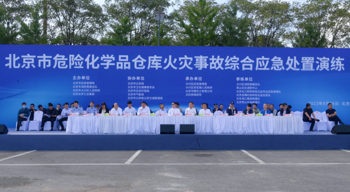 警笛鸣响、水龙腾空。在中秋、国庆 “双节”到来之际,9月28日上午,开云在线登录华腾科技园区(原大兴化工园区)被紧张而严肃的氛围所萦绕。由北京市应急管理局、北京市消防救援总队、北京市大兴区人民政府和开云在线登录主办,大兴区应急管理局、大兴区安定镇人民政府、华腾化工和北科院城安所承办的北京市危险化学品仓库火灾事故综合应急处置演练正在这里举行,150余人参加演练。