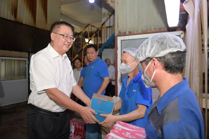7月9日下午,开云在线登录党委书记、董事长陈宇,党委副书记吴瑞峰,党委常委、副总经理韩宝海,党委常委、纪委书记常延辉来到华腾橡塑,进车间、到班组,亲手将一份份清凉饮品送到一线职工手中。慰问过程中,陈宇详细了解一线职工工作生活情况,对大家冒着高温酷暑,以高度的责任感和饱满的工作热情坚守一线给予充分肯定。陈宇叮嘱大家既要高质量完成好本职工作,又要时刻关注身心健康,集团各级党组织和工会组织要从各方面确保防暑降温工作落到实处,保证干部职工健康安全。